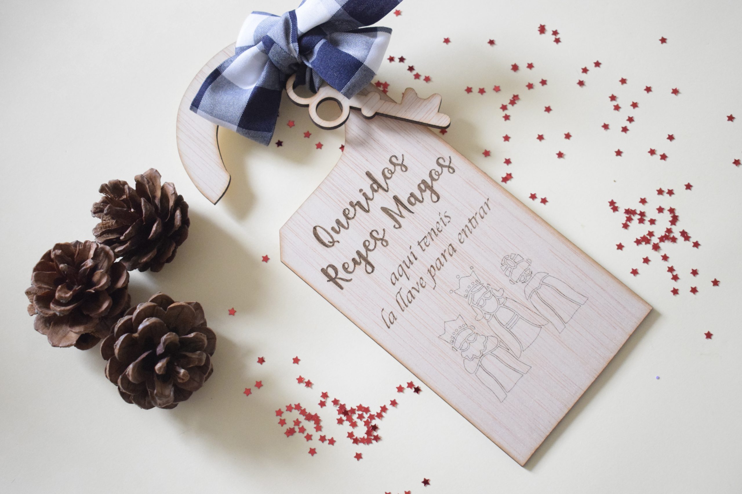 La llave mágica va con un cuelga puerta personalizado con el nombre de la familia o persona que vive en esa casa y a la que los Reyes Magos van a dejar los regalos. Madera de haya de alta calidad grabada con láser.